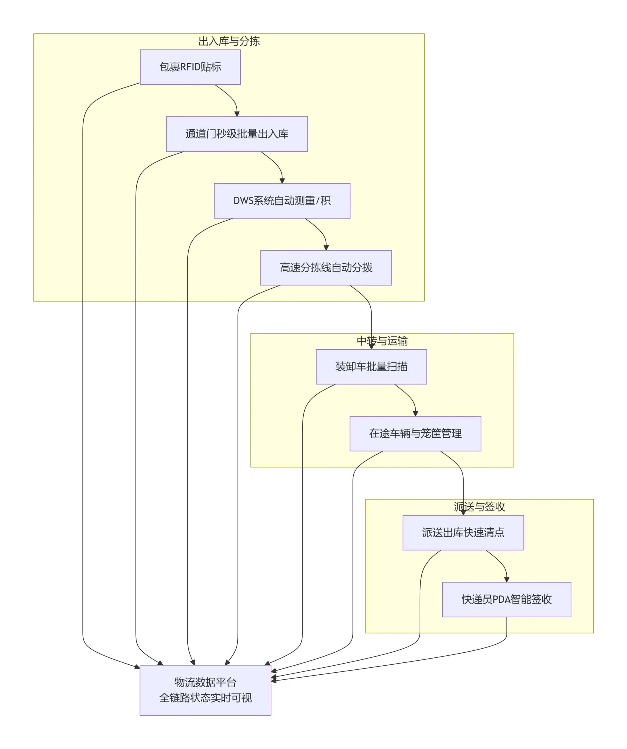本方案的核心是为每一个最小物流单元(如包裹、周转箱、托盘)赋予无源RFID电子标签作为其唯一的“数字身份证”。通过在收件、分拣、装卸、运输、派送等关键节点部署RFID读写设备,系统能自动、远距离、批量地捕获货物的移动信息。